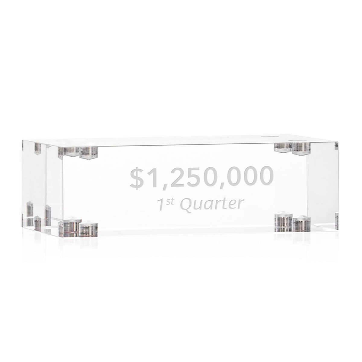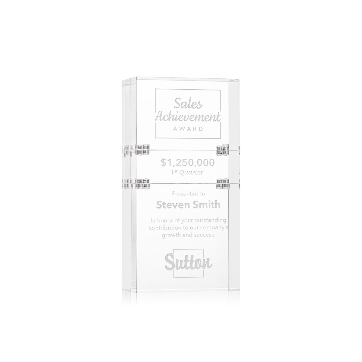Elevate recognition to a new level with our Derringer Award. Its unique stackable design symbolizes growth, progress, and the potential for even greater heights. Perfect for years of service, sales achievements, or any landmark event! This Acrylic award includes 3 pieces: the bottom block, top block, and 1 stacking block. Additional blocks optional.